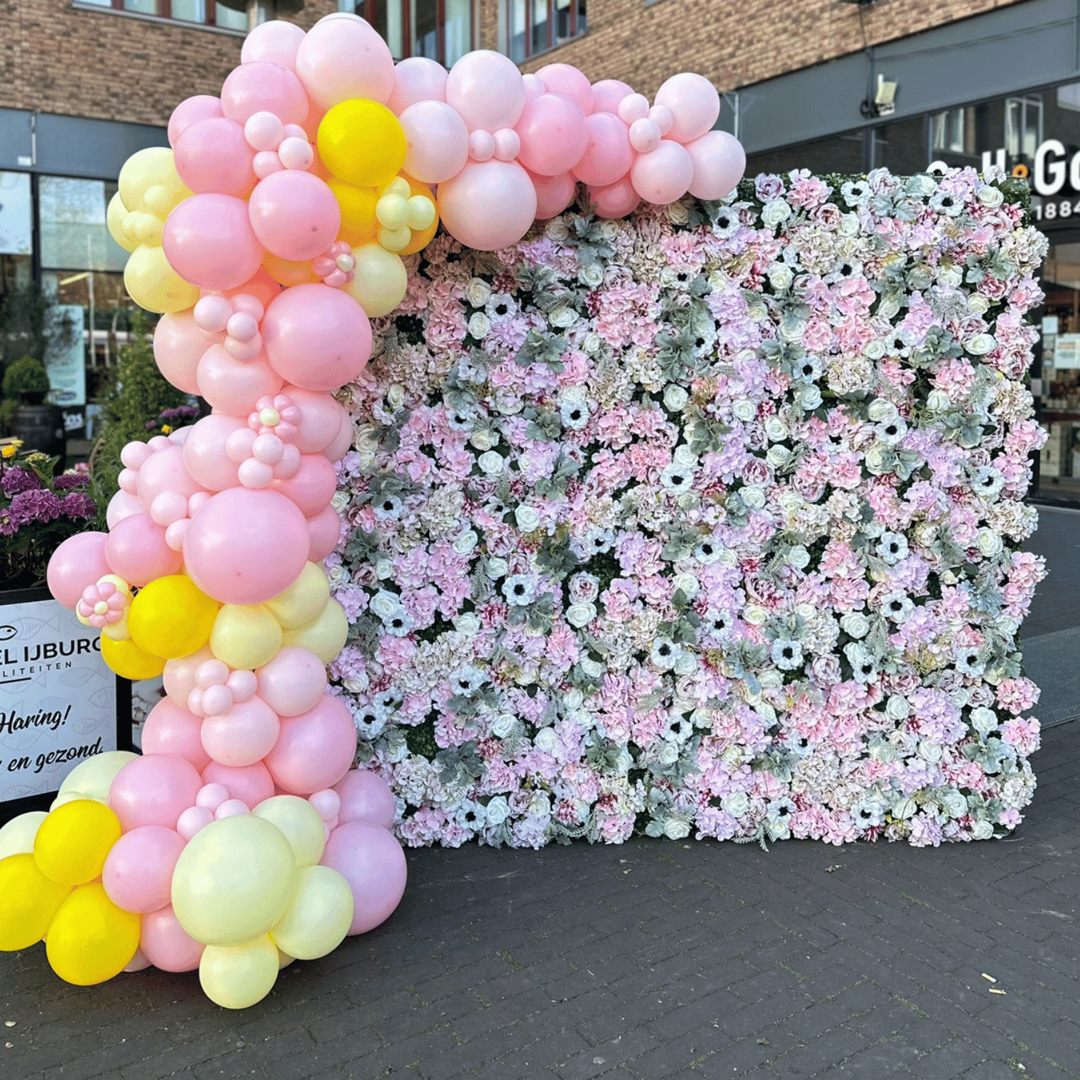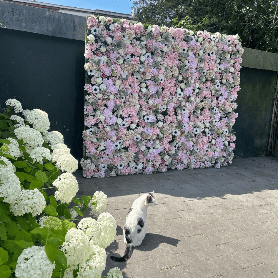 Deze prachtige flowerwall is een echte eyecatcher op je feest. de groene details maken het speels en dromerig, waardoor de roze flowerwall perfect is als foto achtergrond voor je bruiloft, Bridal party of babyshower